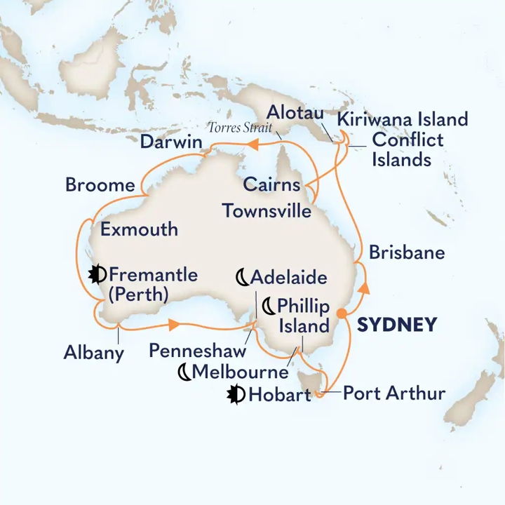 Embark from Sydney’s iconic harbour on this roundtrip cruise around Australia, including Papua New Guinea. Encounter diverse landscapes and unique wildlife — from picturesque Kiriwina Island, rich in history, and indigenous art in balmy Darwin, to enchanting Kangaroo Island and the pint-sized, big-attitude Tasmanian devil. Enjoy more time ashore with overnight stays in port in both Perth and Hobart.