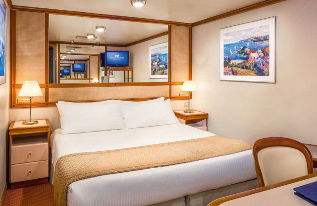 These staterooms are the perfect place to recharge your batteries. Our most affordable option, featuring two twin beds or a queen-size bed. Other amenities include a refrigerator, hair dryer, TV, closet and bathroom with shower.