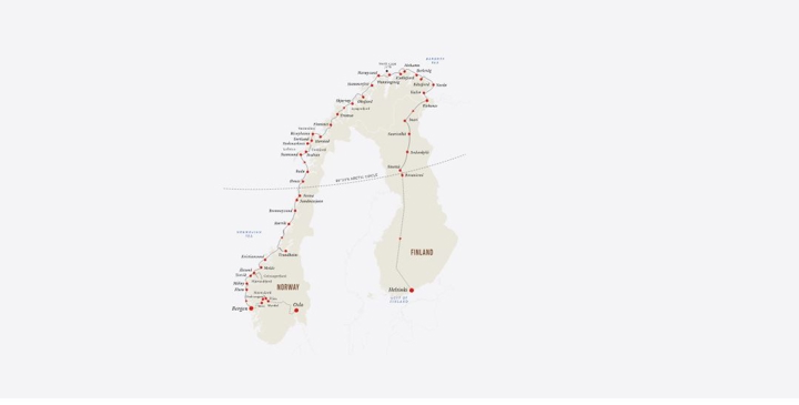 Trace a path through Scandinavia’s most iconic landscapes on a journey that blends coastal wonder with Arctic magic. From the dramatic fjords of Flåm and the historic charm of Bergen to the northern lights of Tromsø and the snow-covered serenity of Finnish Lapland, this voyage offers an unforgettable mix of nature, culture, and Nordic elegance. Explore vibrant harbors, quiet fishing villages, and icy wildernesses as you travel from Oslo to Helsinki through a tapestry of unforgettable moments.