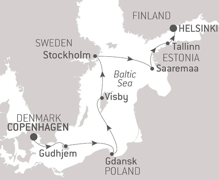 From the charming fishing village of Gudhjem and the historic Hanseatic city of Gdańsk—renowned for its amber and shipbuilding legacy—to the beautifully preserved medieval town of Visby, a UNESCO World Heritage Site, this journey also takes you to the elegant Swedish capital, Stockholm, and the captivating city of Tallinn, brimming with remarkable sights. Experience the very heart of the Baltic!