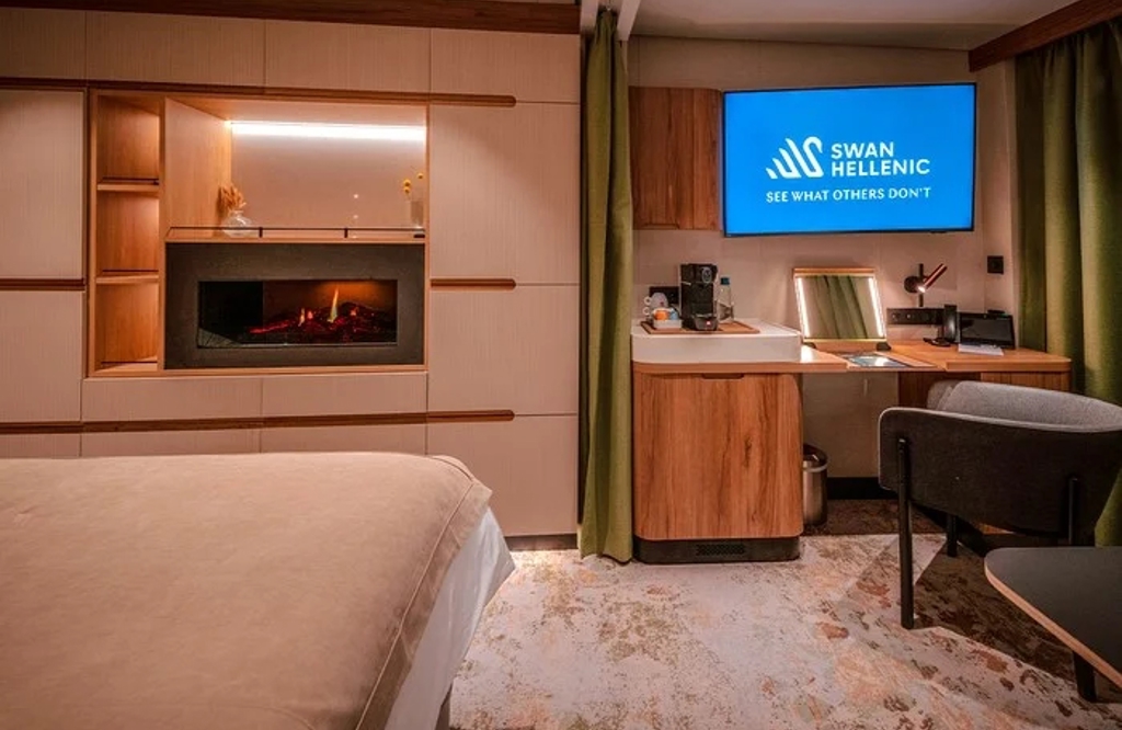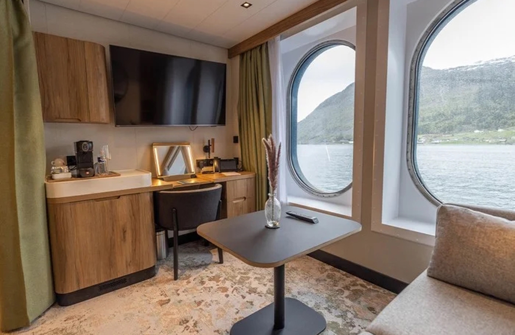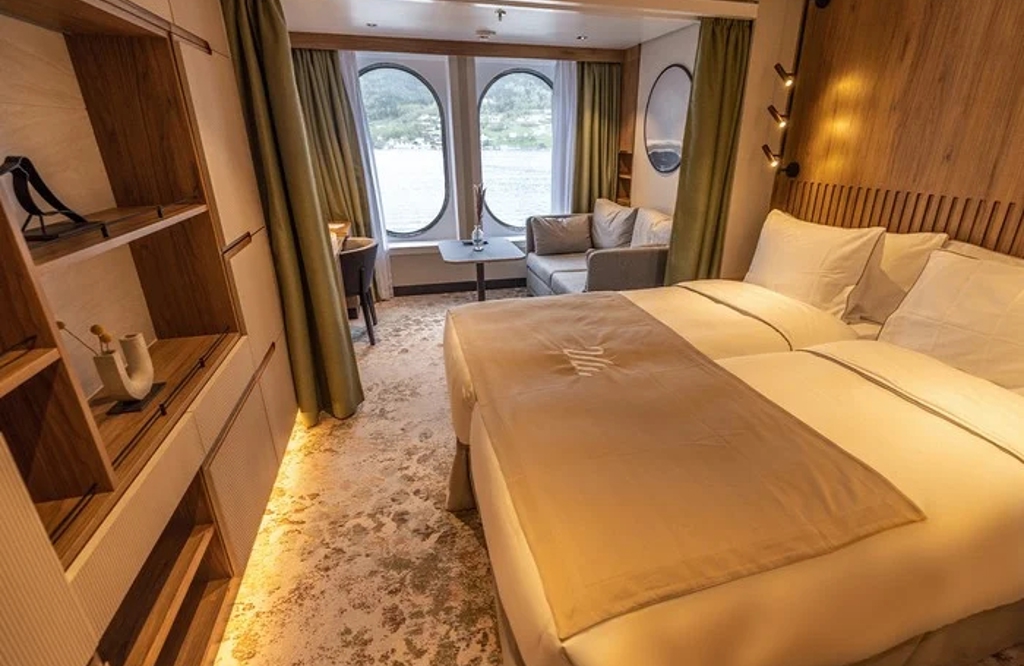 Oceanview Staterooms measure 20m2 (215ft2) and can accommodate two guests. They feature two single beds or a double bed, bedroom with living room area, a flame-effect fireplace and a luxurious bathroom.