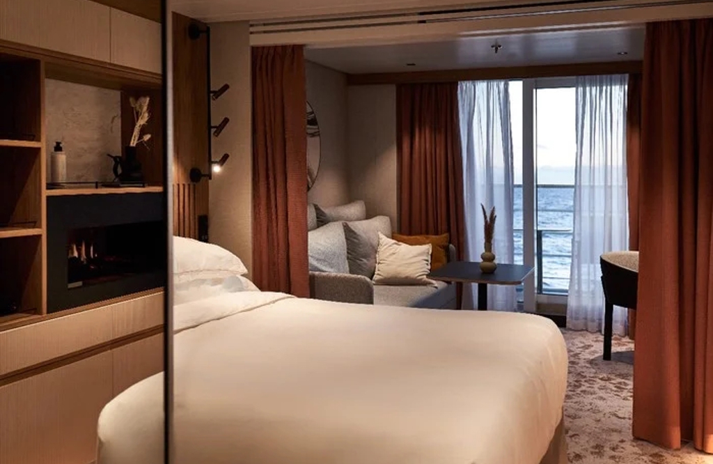 Balcony Staterooms measure 25m2 (269ft2) – including a 5m2 (54ft2) private balcony – and can accommodate two or three guests. They feature two single beds or a double bed, bedroom with living room area, a flame-effect fireplace and a luxurious bathroom.