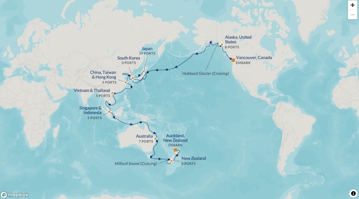 Discover the world at a gentler pace on Azamara’s remarkable 114-night Grand Voyage. Departing Vancouver, sail through Alaska, Japan, China, South-East Asia, Australia, and New Zealand before arriving in Auckland. With longer stays, overnight visits, and Extended Destination Days, Azamara gives you more time to connect deeply with every destination.