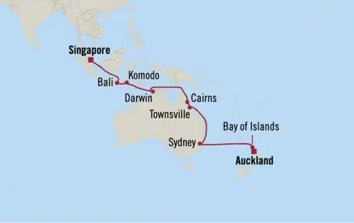 Cruise into iconic Sydney Harbour and enjoy the vibrant nightlife with an overnight stay onboard before continuing to the sun-kissed beaches and ancient rainforests of Queensland. Delve into Aboriginal culture and art in Darwin, and discover Komodo — a UNESCO World Heritage Site and home to the legendary Komodo dragon. Enjoy more time ashore in lush Bali and dynamic Singapore, both featuring overnight stays in port.