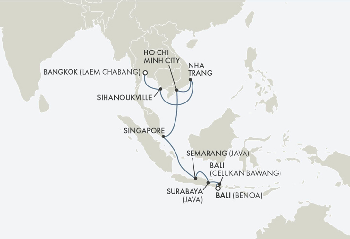Journey through Southeast Asia’s most captivating destinations, from the tropical beauty of Bali and the cultural richness of Java to the vibrant streets of Singapore. Continue across the South China Sea to experience the history and charm of Ho Chi Minh City, the coastal allure of Nha Trang, and the golden beaches of Sihanoukville, before concluding with two unforgettable days in Bangkok. A perfect blend of culture, heritage, and breathtaking landscapes awaits.