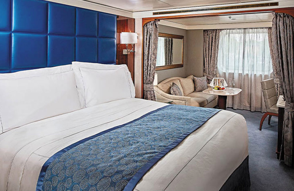 Even the smaller suites on Seven Seas Navigator® are spacious, smartly designed and luxuriously furnished. This suite offers a large picture window that lets you rejoice in magnificent ocean views and plenty of natural light. Settle into your cozy surroundings, pamper yourself with lavish bath products, wrap yourself in a plush bathrobe and uncork your welcome bottle of Champagne as your ship heads out to sea.