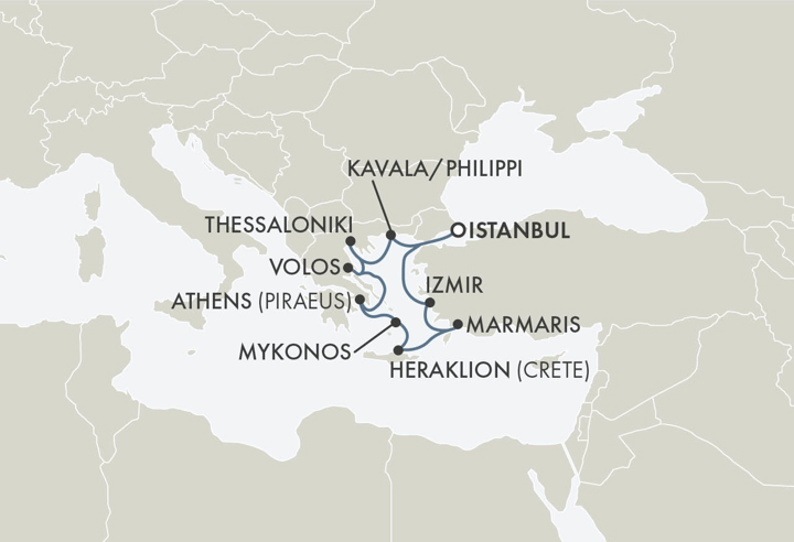 Experience the crossroads of history and beauty on a journey through the Aegean and Eastern Mediterranean. From the vibrant energy of Istanbul to the ancient wonders of Philippi, Thessaloniki, and Athens, each stop reveals a new layer of culture and tradition. Wander the charming streets of Mykonos, explore the legends of Crete, and soak in the coastal allure of Marmaris and Izmir. With breathtaking days at sea along the Aegean, this voyage offers the perfect balance of discovery, relaxation, and timeless beauty.