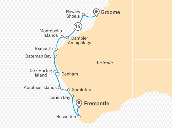 Experience an awe-inspiring journey along Western Australia’s pristine coastline. Sail from Perth (Fremantle) to Broome on this 14-night ultra-luxury voyage. Traverse shimmering coral reefs, rugged islands, and vibrant towns aboard your intimate Discovery Yacht.