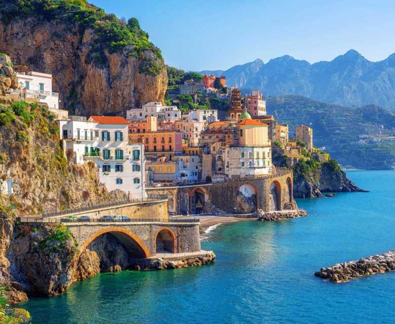 The Amalfi Coast has been called the greatest meeting of land and sea on earth. Situated in the Campania region between Sorrento and Salerno, Amalfi and Positano are the two main towns on the world-famous Amalfi Drive - renowned as the most scenic and romantic road in Italy. The road is carved into the side of rocky cliffs plunging into the sparkling sea. Erosion has sculpted the rocky slopes into gargoyle shapes and hollowed out fairy grottoes where the air is tinted turquoise by the glowing blue water below. During the Middle Ages, Amalfi was an independent maritime state with a population of 50,000. The ship compass was invented here in 1302. Approximately 10 miles away from Amalfi is the village of Ravello. An enchanting village with wonderful views and quiet lanes, Ravello boasts romantic gardens surrounding medieval ruins, affording magnificent views of the entire Bay of Salerno.