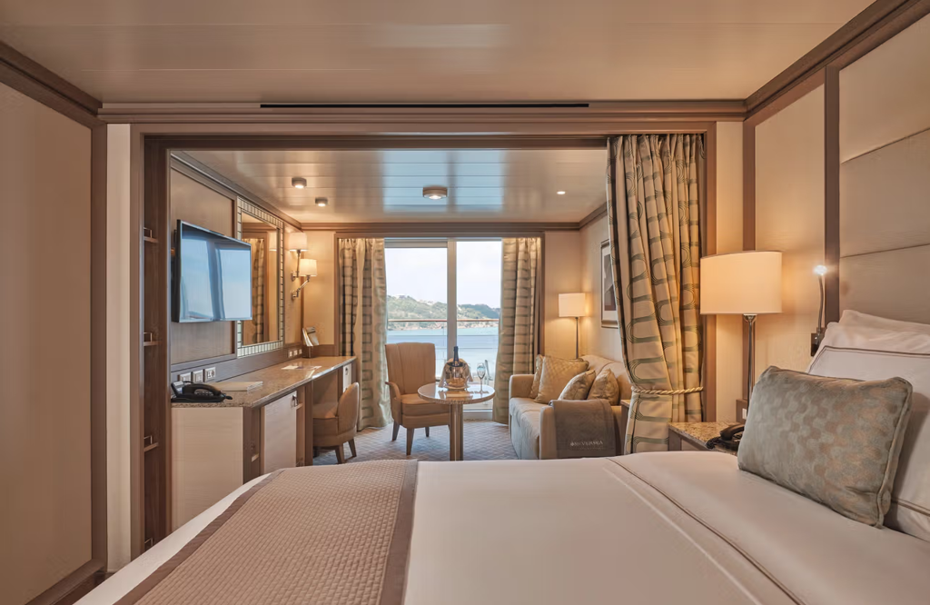 The Vista Suite provides generous living space for all travelers. The Vista Suite offers all the comfort and attention to detail that you can expect aboard. A generous expanse of interior comforts—elegant decor, a stunning marble bathroom, and an ample seating area make this a cozy home away from home.
