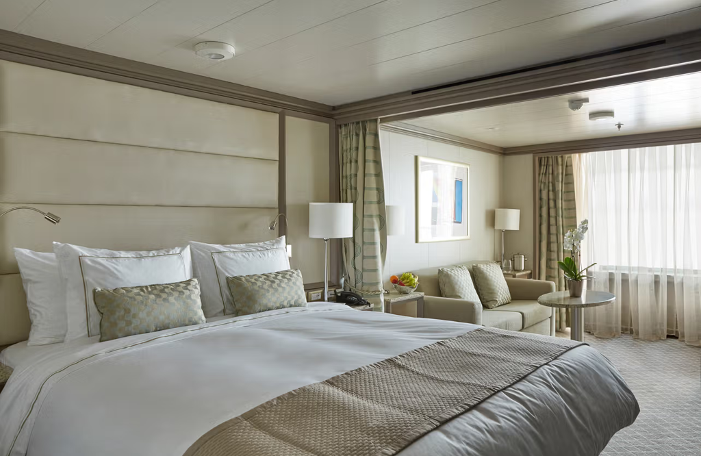 The Deluxe Veranda Suite offers a comfortable living space, close to the heart of the ship. With its preferred midship location and all the comfort and attention to detail that you can expect aboard, the Deluxe Veranda Suite is the savvy traveler’s paradise—both inside and out. Elegant decor, a stunning marble bathroom, and an ample seating area make this a cozy home away from home.