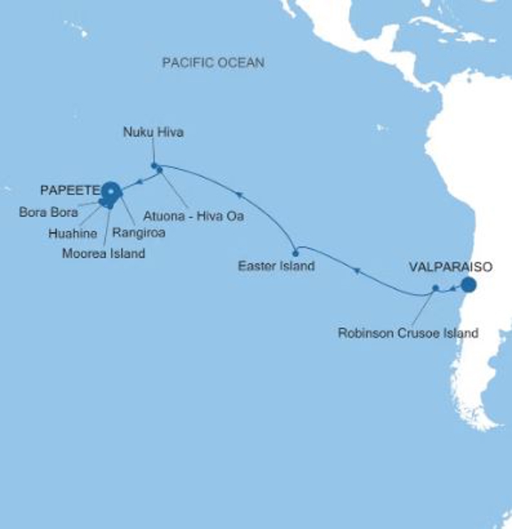 Indulge in an adventure that delves into the heart of the South Pacific Islands and goes from colorful Valparaiso all the way to breathtaking Papeete. Start with Robinson Crusoe Island, followed by four relaxing days at sea then witness the iconic moai of Easter Island during a two day stay. Enjoy five days of onboard R&R, then explore the Marquesas Islands for two days. Witness the beauty of French Polynesia with stops in Rangiroa, Huahine, Bora Bora and Papeete before disembarkation.