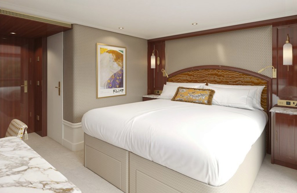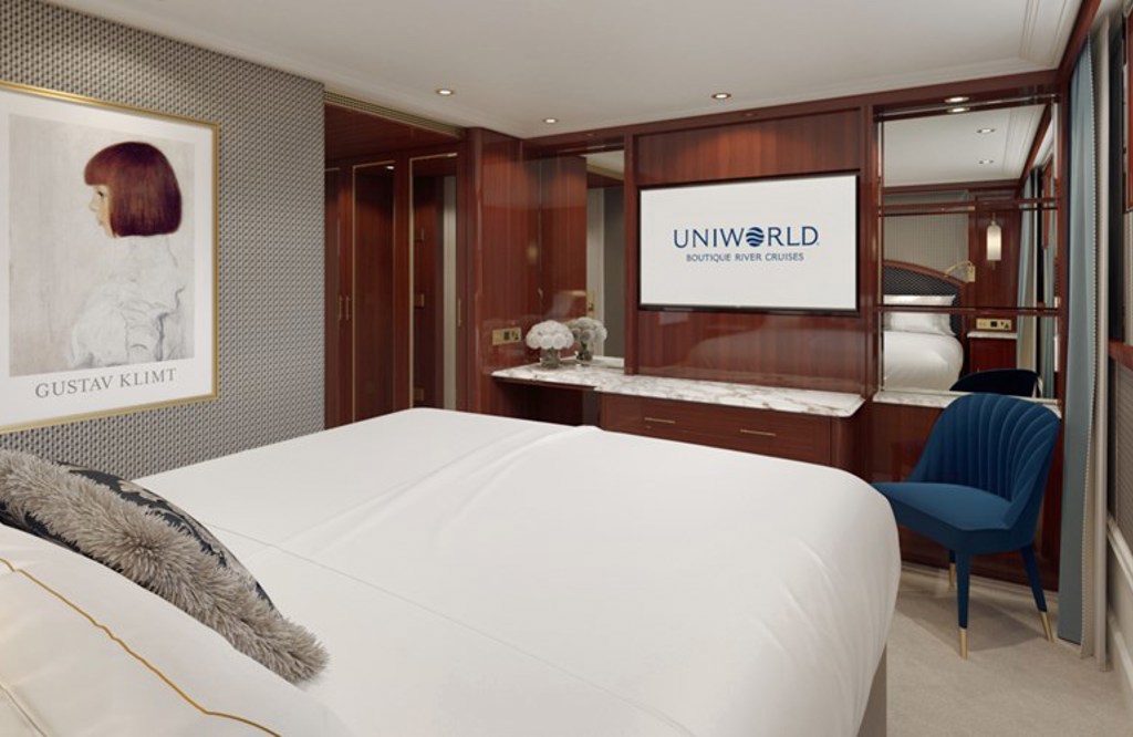 Luxurious riverview stateroom (194 - 227 sq ft / 18 - 21 sq m) with a French balcony, Handcrafted Savoir® Beds of England, built-in closet, hair dryer, safe, individual thermostat, flat-screen TV with infotainment center, Marble bathroom with Asprey bath and body products, plush towels, towel warmer, heated mirror, backlit magnifying mirror, comfortable bathrobes and slippers.