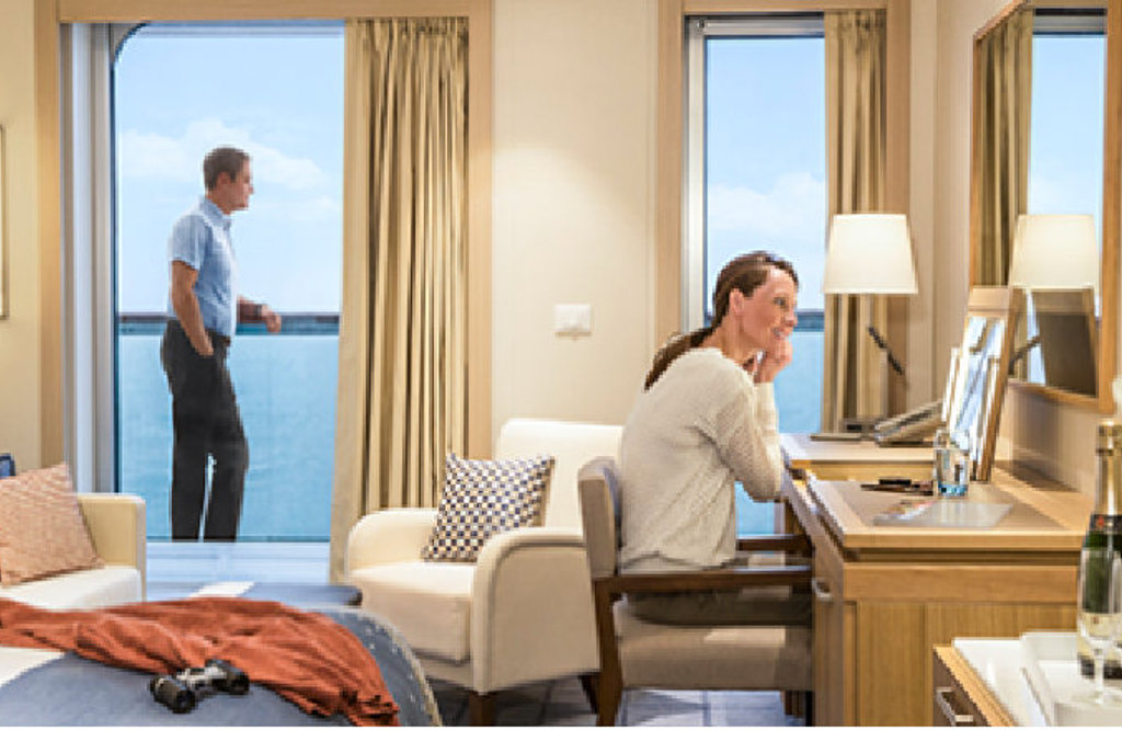 King size bed with luxury linens & pillows, private veranda, priority booking of spa treatment, priority reservation at each alternative restaurant, free wi-fi, 42" flat-screen tv, outlets & USB ports, Mini-bar, security safe, hair dryer, direct-dial phone & cell service, private bathroom with glass-enclosed shower, heated bathroom floor & anti-fog mirror, purified water, twice-daily housekeeping, welcome bottle of champagne, 24-hour room service, In-suite binoculars, coffee brewer & Norwegian blanket.