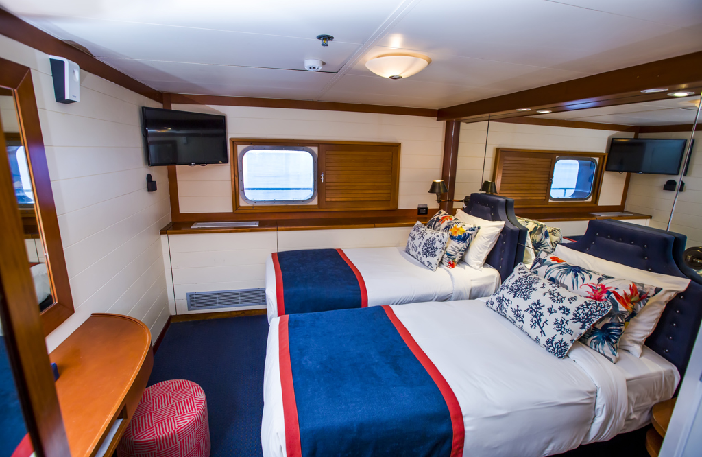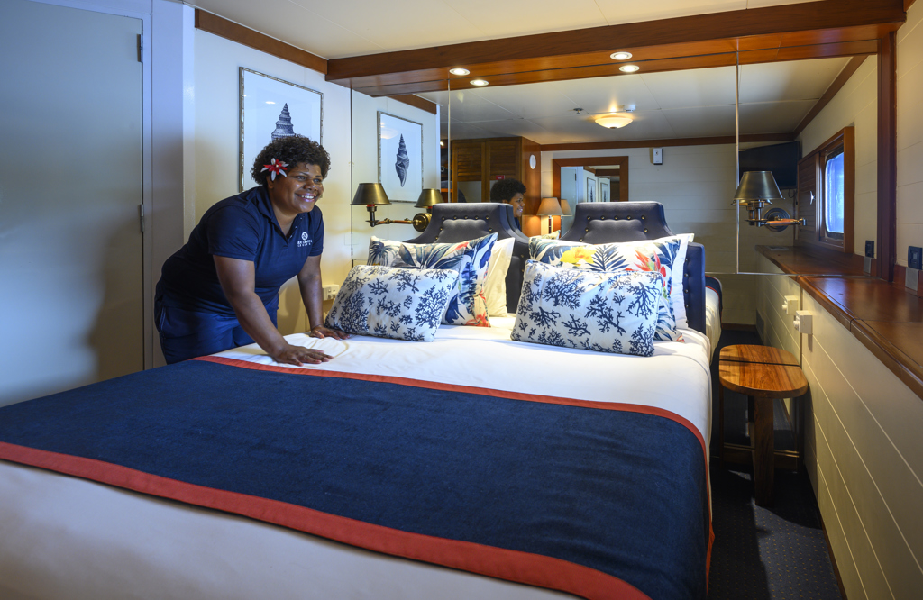 The well-appointed rooms include a ‘yacht-style’ en suite, wardrobe, TV (grab a hard drive of movies from reception for your viewing pleasure), and individually controlled air conditioning. Cabins also include a mini bar fully stocked on the day of departure with complimentary inclusions of a selection of premium beer and soft drinks, sparkling wine, homemade cookies, and snacks.