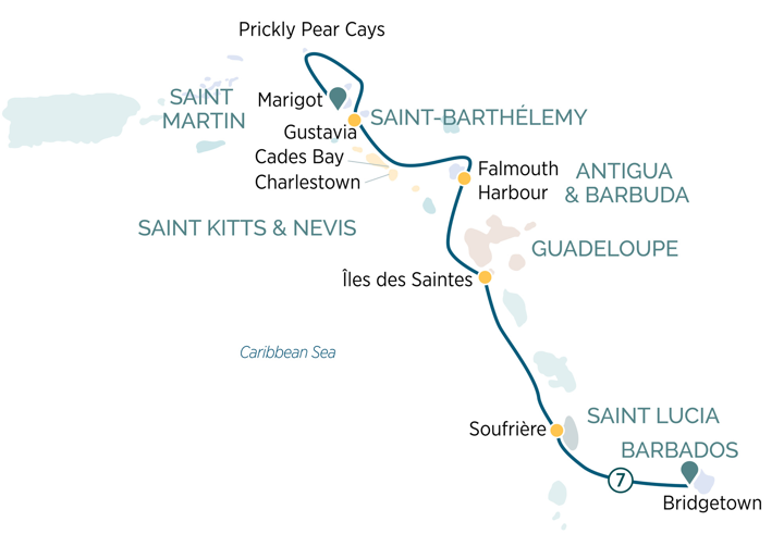 Embark on this 7-night Caribbean cruise starting from Marigot, aboard an Emerald Cruises luxury yacht. Explore the low-lying island of Anguilla, famed for its enticing white-sand beaches and coral reefs. Discover the brightly coloured houses and distinctive architecture in Gustavia. Admire the UNESCO World Heritage site Nelson’s Dockyard in Falmouth Harbour and swim in the tranquil waters of Iles des Saintes. Your Caribbean voyage concludes in Barbados, known for its beaches and vibrant culture.