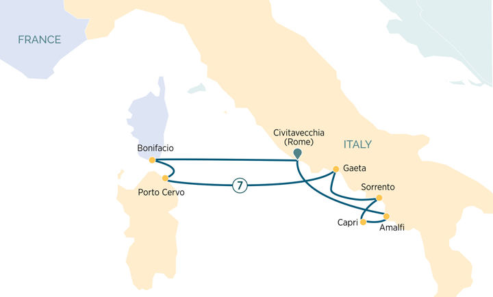 The captivating 7-Night cruise along the Italian coast takes you on a luxurious voyage that begins and ends in Civitavecchia, an important cruise port and gateway to Italy’s ancient capital, Rome. Admire the elegant architecture of the spectacular Amalfi Coast, dine under the stars and fragrant lemon trees on the Italian island of Capri, and visit the stunning town of Bonifacio, set on the top of southern Corsica. Set sail for a journey like no other, with iconic Italian cuisine, limestone cliffs dramatically soaring from azure waters, and historic sites dating back to Roman and medieval times.