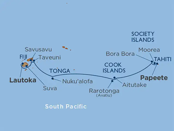 Tahiti’s turquoise waters give way to a journey through some of the South Pacific’s most enchanting islands. From the lush peaks of Moorea and iconic lagoons of Bora Bora, to the pristine shores of Aitutaki and cultural heartbeat of Rarotonga, each destination adds a layer of wonder. The voyage continues through the warmth of Tonga, the wild beauty of Taveuni, and the charm of SavuSavu, before arriving in the vibrant port of Lautoka, Fiji — a perfect finale to this tropical odyssey.
