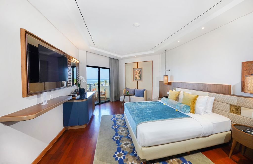 The New Premier Ocean Rooms at Grand Mirage Resort & Thalasso Bali offer a 42-square-meter beachfront retreat with panoramic ocean views, elegant Balinese design, modern amenities, and a private balcony for a relaxing stay.