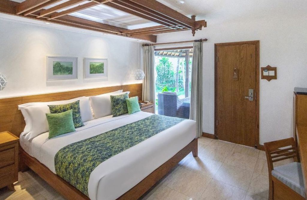 The Deluxe Garden Bungalow at Legian Beach Hotel offers a serene tropical retreat with traditional Balinese design and beautiful garden views.