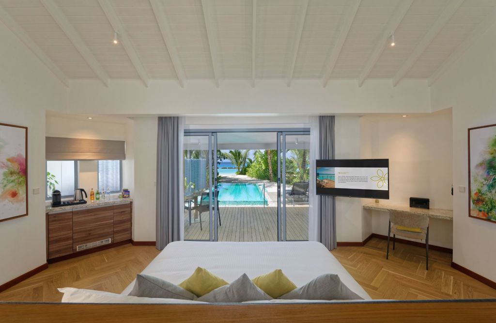 The Overwater Villas are luxury villas with modern comforts along with bespoke views of the lagoon. The spacious bedroom features a king-sized bed and daybed.