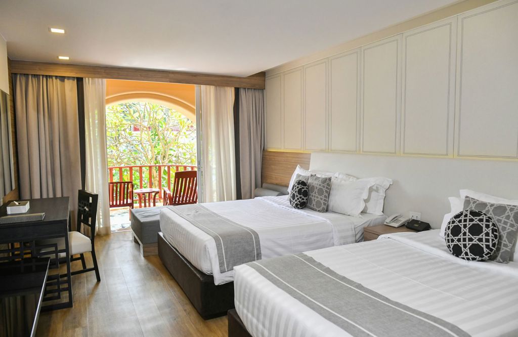 The deluxe pool view room at Phukete Graceland offers a serene escape, featuring elegant décor, a spacious balcony overlooking the sparkling azure pool, and luxurious amenities that ensure a relaxing stay in paradise.