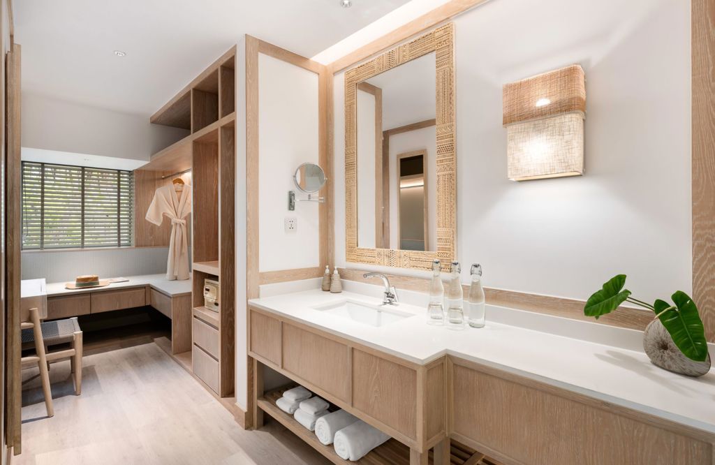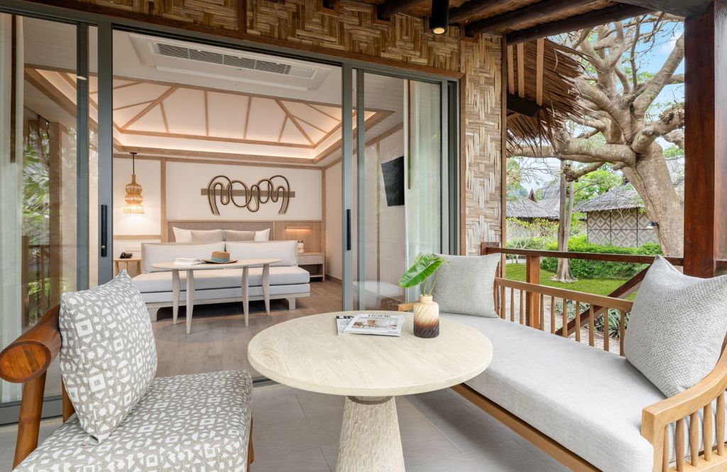 Your elegant 45-square-metre villa boasts high ceilings, a calming colour palette, and natural accents like locally sourced grass lampshades. Relax in a plush bed with a nautical-inspired headboard, refresh in a spacious bathroom, enjoy coffee from your in-villa machine, and unwind on the terrace in a bamboo chair, soaking up the tropical atmosphere.