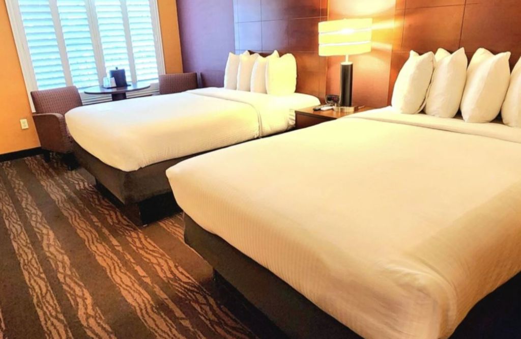 Beyond the pool with its famous topiary shrubs you can see the Disneyland Resort opposite. The main entrance to Disneyland Park is about a 15 minute walk away, but getting around Anaheim from this hotel is a breeze. The Anaheim Resort Transit shuttle stops right in front of the hotel.