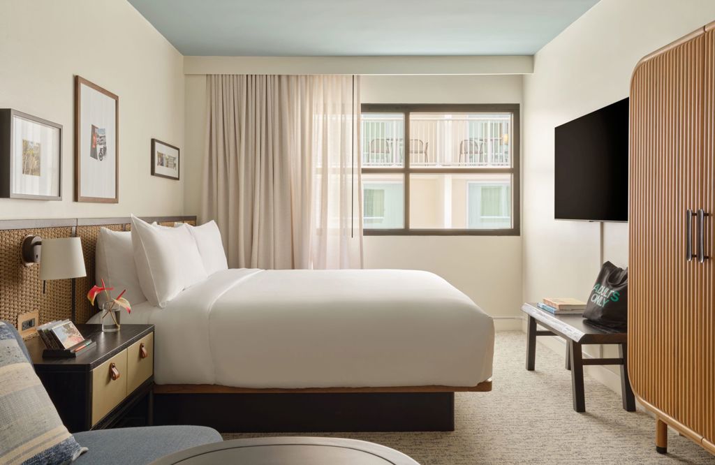 This relaxed, grown-up retreat, is designed for those seeking vibrant social energy, local discovery, and the true spirit of O’ahu. Situated behind the International Market Place, which is filled with shops and restaurants, Romer House Waikiki is about 10 mins walk to Waikiki Beach. The property has a local Waikiki- neighbourhood blended with island-beach vibe, and furnishings throughout the property reflect this. Rooms include a mini-fridge and kettle, with neutral tones. The Backyard is home to the heated pool, suitable for a dip, and a funky bar, complete with daily happy hour. Izakaya 855-Aloha is the onsite restaurant serving Japanese and Hawaiian cuisine.