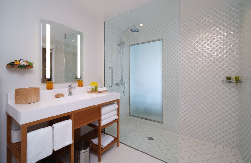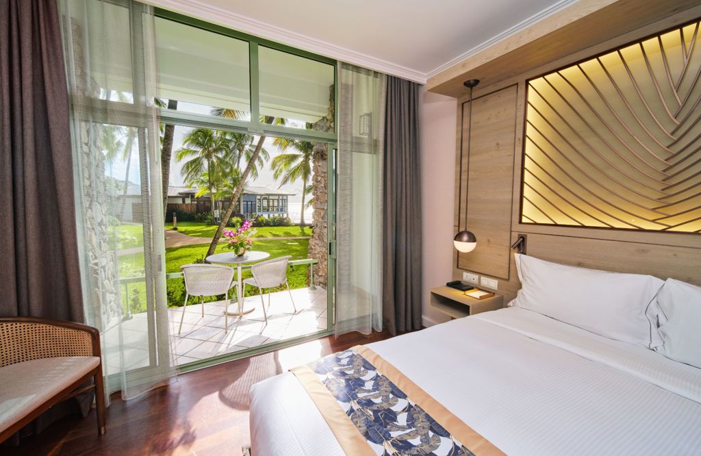 Relax in this 409 sq. ft. guestroom featuring a king bed, stylish island-inspired décor, a spacious seating area, and serene garden views.