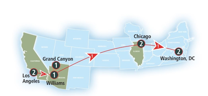 - One-way Amtrak® from Los Angeles to the Grand Canyon to Chicago on the Southwest Chief®; Chicago to Washington, DC on the Capitol Limited® in Coach accommodations